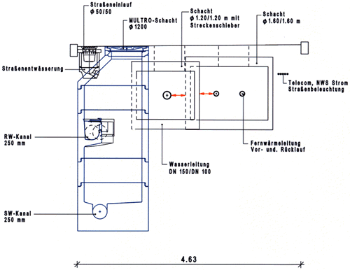 Mit dem MULTRO®-Schachtsystem wird deutlich weniger Platz in der Straße benötigt. Wie die beiden Pläne zeigen, können bei den dargestellten Nennweiten 1,12 m eingespart werden, das sind über 20% der Straßenbreite gegenüber der Verlegung mit Doppelschächten.